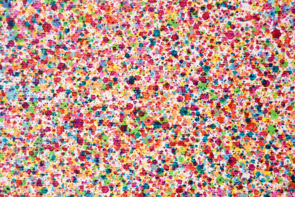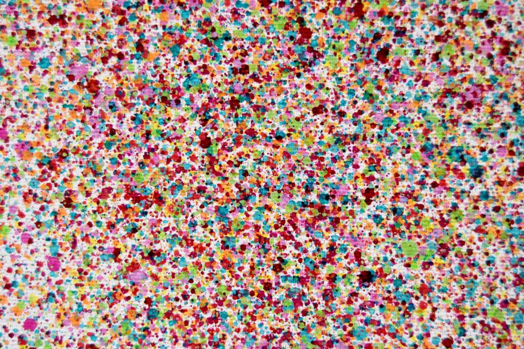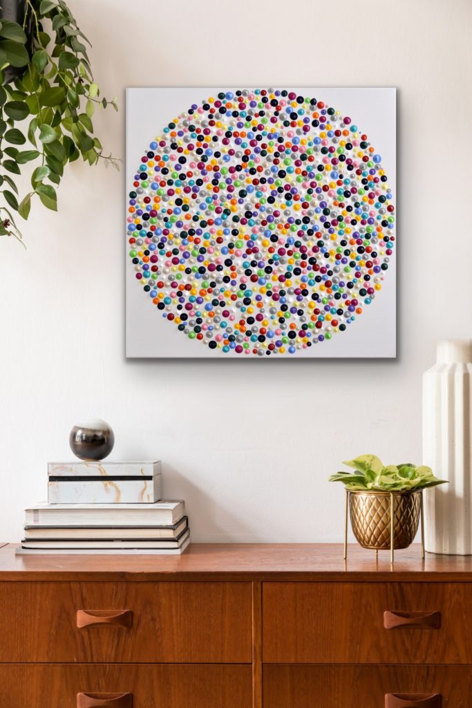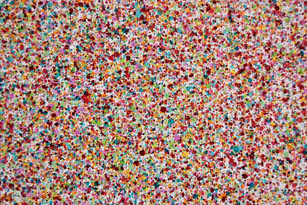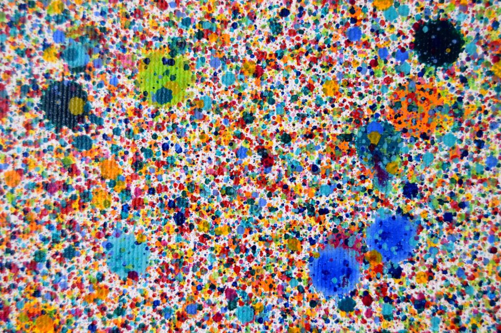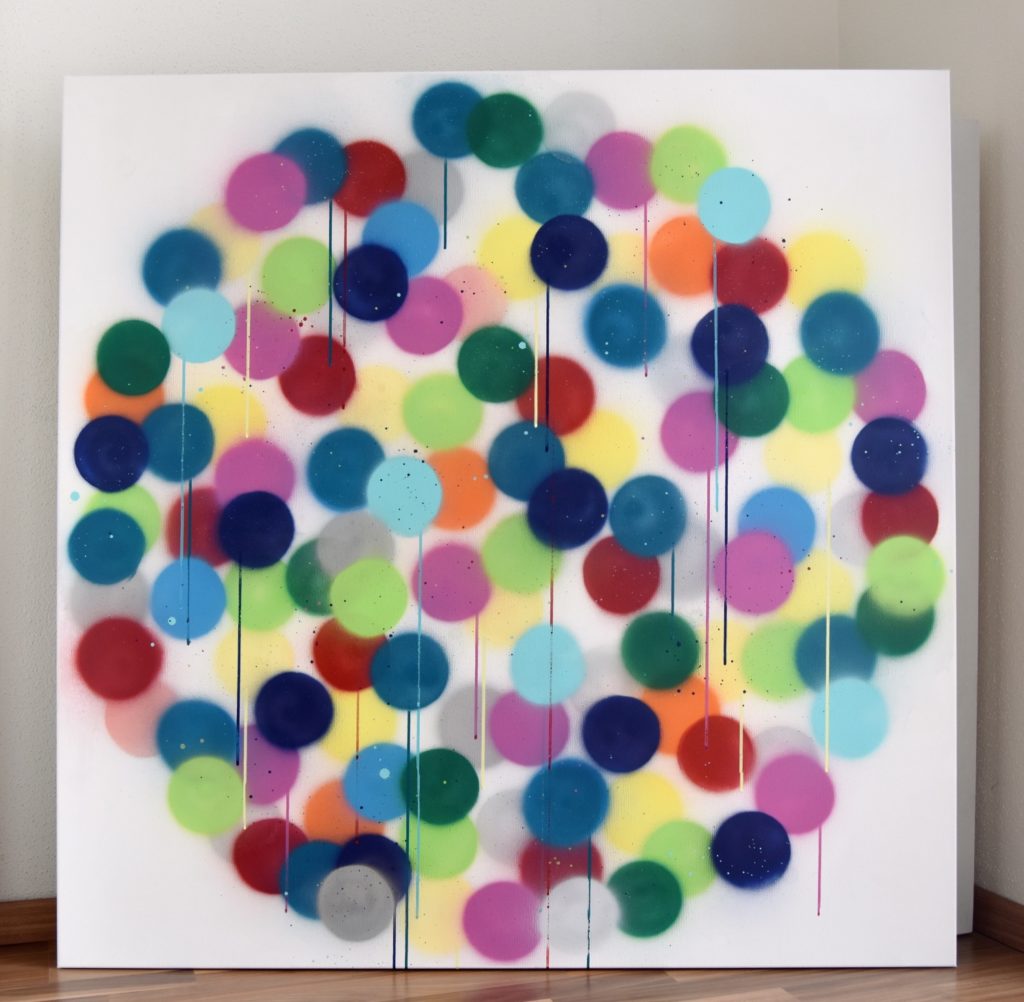 My message: Time is moving fast, and our minds are strongly influenced by the media and social platforms. I want people to pause their thoughts, calm down, follow the lines, journey with the circles, gaze at the dots and color fields in my works, and feel the vibrancy and allure of pure colors and common shapes.