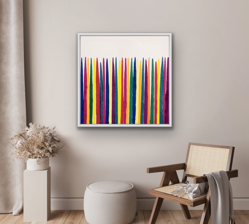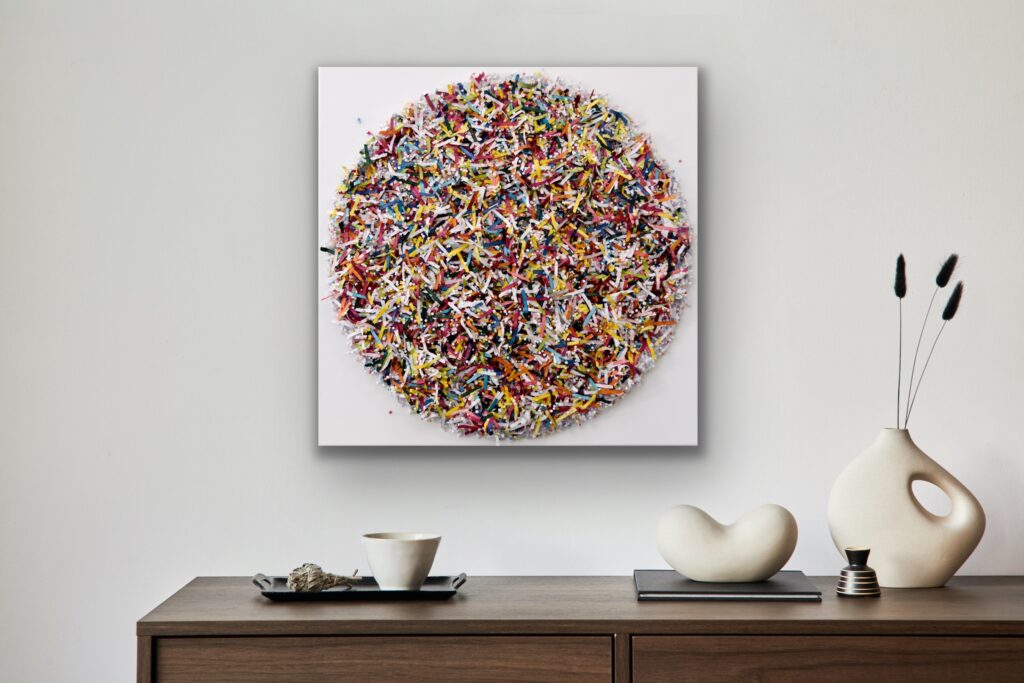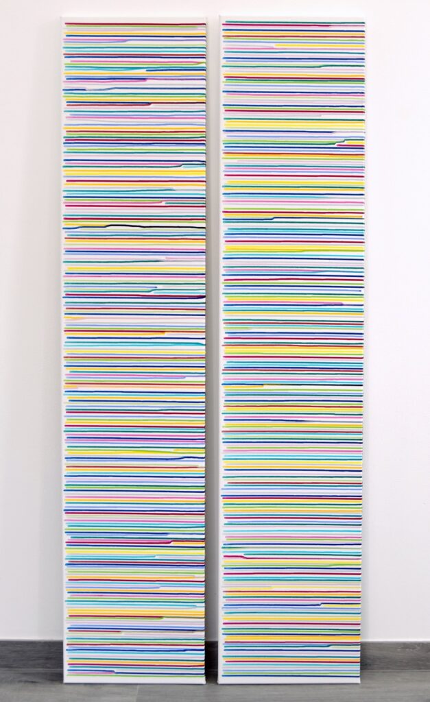 My inspiration: I’m obsessed with bold and powerful colors arranged in common geometric shapes. That’s me – clear and structured at work, but also always creative, curious, passionate, and a bit imperfect. I’m inspired by the color itself and adore its purity. Every individual color gets my undivided attention. My works are painted color by color. In this way, I fill the canvas step by step with dynamic vitality and structure.
